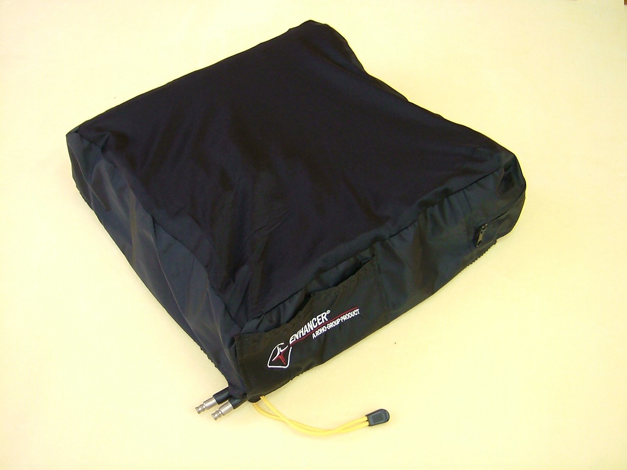 ロホエンハンサー 38cm×38cm メーカー:ペルモビール株式会社 入手先:アビリティーズケアネット株式会社 特徴:空気構造のクッション。脚を中心に、両サイドに高さの違うセルを組み合わせ、前後・左右の座位バランスをサポートする。体の前かがみを防止しながら、同時に側面の安定性も増加させている。