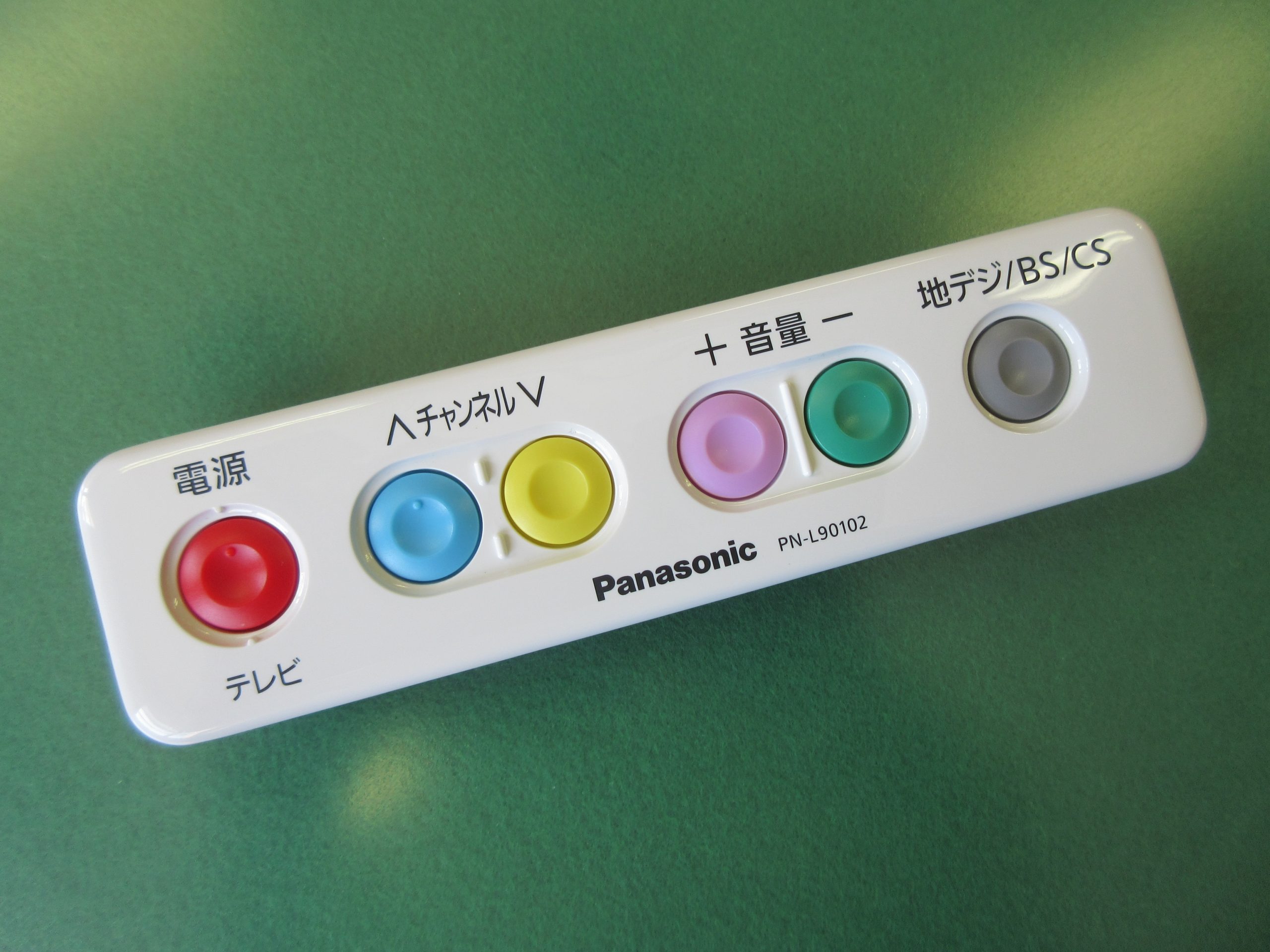 レッツ・リモコンAD メーカー:パナソニック エイジフリー株式会社 特徴:手が不自由なために従来のテレビリモコンが難しくて使いにくいという方を対象とした、「電源・チャンネル・音量」に限定して、様々な入力方法や設定を備えたテレビリモコンです。