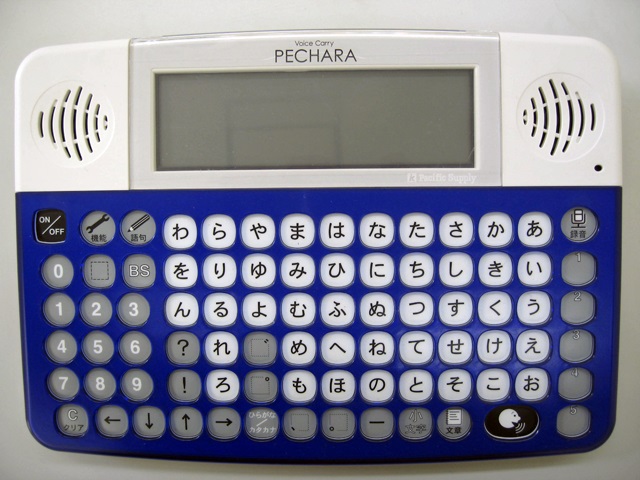 ボイスキャリー ペチャラ VCP-001 メーカー:パシフィックサプライ株式会社 入手先:パシフィックサプライ株式会社 特徴:文字盤の文字キーを押すことで文章を入力・作成します。入力した文章は発声キーを押すことで読み上げる携帯用会話補助装置です。音声録音再生機能を搭載しています。