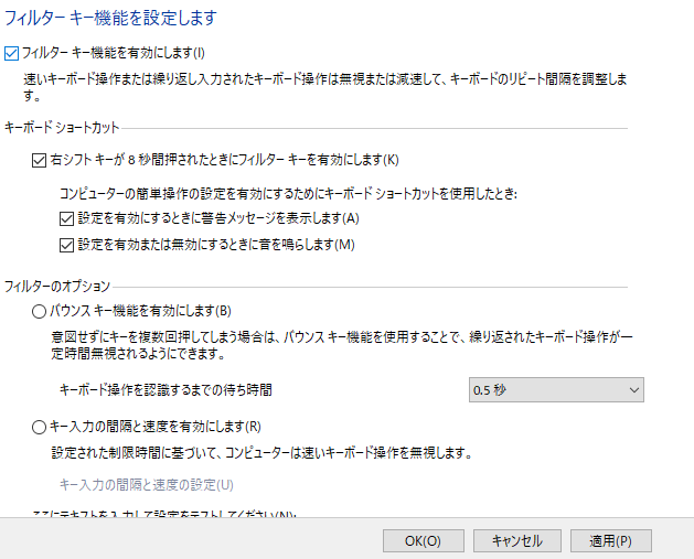 - Windowsに標準搭載される補助機能。 キーの入力が有効になる時間の設定やキーリピート時間の設定ができる。 不随意運動があり震えなどにより、任意のキーを押すことが難しく誤入力がある場合